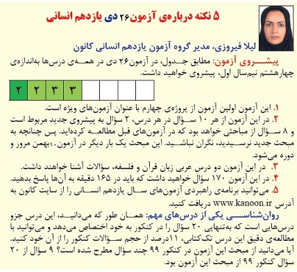 * نکتهی 5: میتوانید برنامهی راهبردی آزمونهای سال یازدهم انسانی را از سایت کانون به آدرس www.kanoon.ir دریافت کنید.