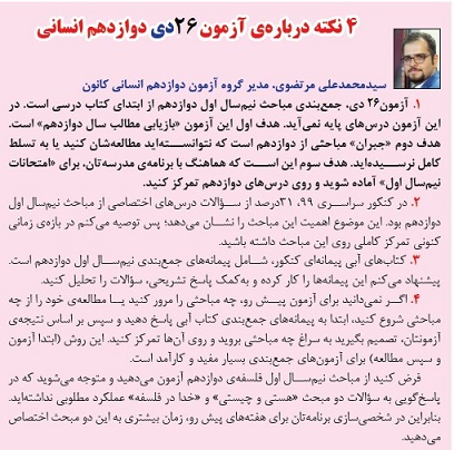 1. آزمون 26 دی، جمعبندی مباحث نیمسال اول دوازدهم از ابتدای کتاب درسی است. در این آزمون درسهای پایه مطرح نمیشود. هدف اول این آزمون «بازیابی مطالب سال دوازدهم» است. هدف دوم «جبران» مباحثی از دوازدهم است که نتوانستهاید مطالعه کنید یا به تسلط کامل برسید. هدف سوم این است که هماهنگ با برنامهی مدرسهتان، برای «امتحانات نیمسال اول» آماده شوید و روی درسهای دوازدهم تمرکز کنید.