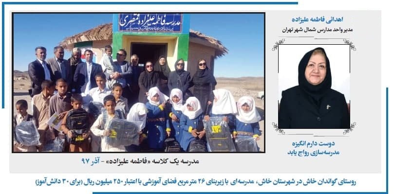 مدرسه یک کلاسه «فاطمه علیزاده» واقع در روستای گواندان خاش شهرستان خاش نیز توسط فاطمه علیزاده مدیر مدارس شمال شهر تهران با ظرفیت ۳۰ دانش آموز با ۲۶ مترمربع زیربنای فضای آموزشی با تامین اعتباری بالغ بر ۲۵۰ میلیون ریال ساخته شد.
