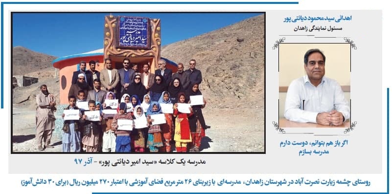 همچنین مدرسه یک کلاسه «سید امیر دیانتی پور» در روستای چشمه زیارت نصرت آباد شهرستان زاهدان با مساحت ۲۶ مترمربع زیربنای فضای آموزشی و ظرفیت ۳۰ دانش آموز با تامین اعتباری بالغ بر ۲۷۰ میلیون ریال توسط سید محمود دیانتی پور مسئول نمایندگی بنیاد قلم چی زاهدان احداث شد.