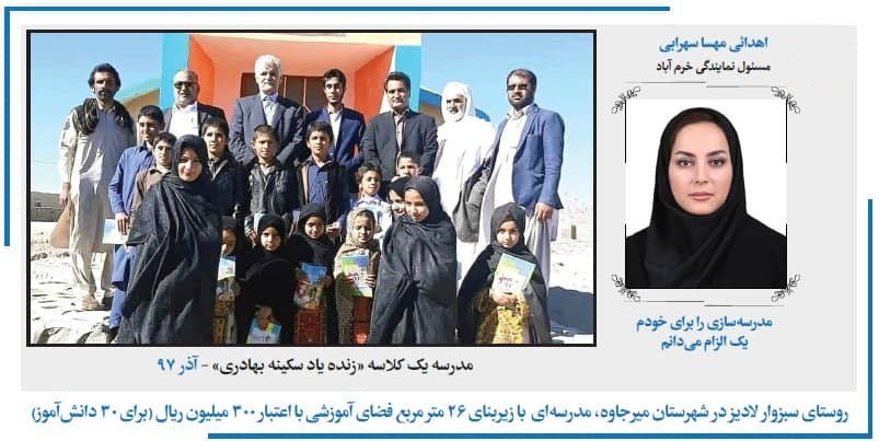 ساخت مدرسه یک کلاسه «زنده یاد سکینه بهادری» در روستای سبزوار لادیز شهرستان میرجاوه با ظرفیت ۳۰ دانش آموز با ۲۶ مترمربع زیربنای فضای آموزشی با تامین اعتباری بالغ بر ۳۰۰ میلیون ریال توسط مهسا سهرابی مسئول نمایندگی بنیاد قلم چی خرم آباد انجام شد.
