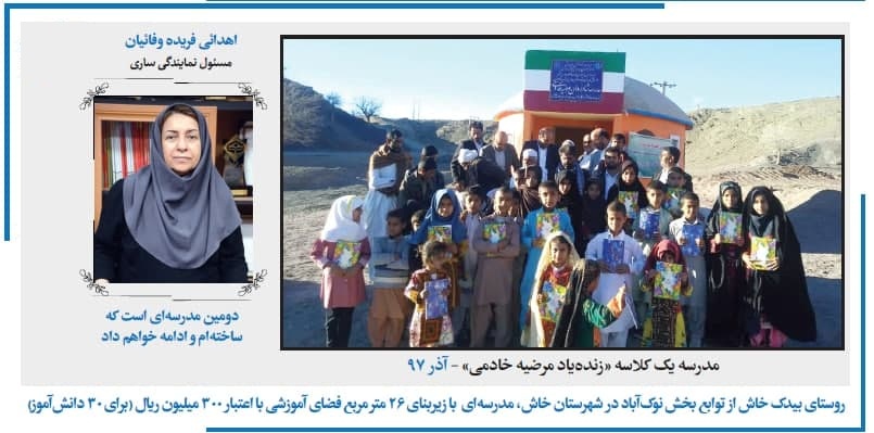 همچنین مدرسه یک کلاسه «مرضیه خادمی» در روستای بیدک خاش از توابع بخش نوکآباد شهرستان خاش با مساحت ۲۶ مترمربع زیربنای فضای آموزشی و ظرفیت ۳۰ دانش آموز با تامین اعتباری بالغ بر ۳۰۰ میلیون ریال توسط فریده وفائیان مسئول نمایندگی بنیاد قلم چی ساری احداث شد.
