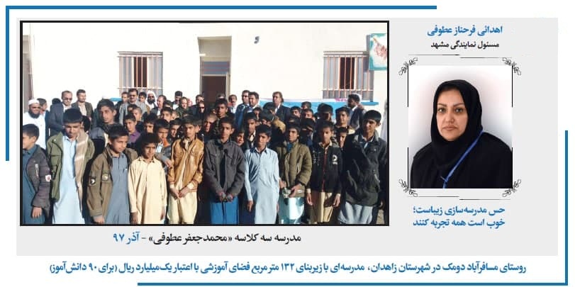 ساخت مدرسه سه کلاسه «محمدجعفر عطوفی» در روستای مسافرآباد دومک شهرستان زاهدان با ظرفیت حدود ۹۰ دانش آموز با ۱۳۲ مترمربع زیربنای فضای آموزشی با تامین اعتباری بالغ بر یک میلیارد ریال توسط فرحناز عطوفی مسئول نمایندگی بنیاد قلم چی مشهد انجام شد.