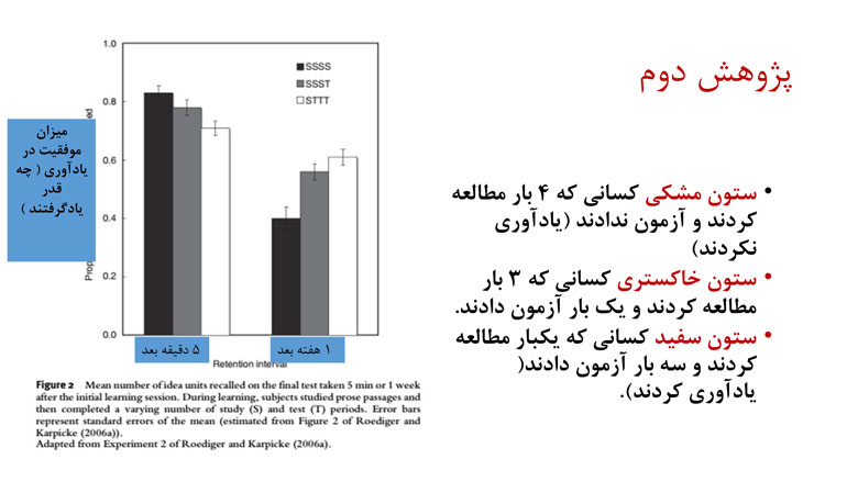 برای یادگیری لغات زبان سواحیلی ( یک زبان آفریقایی) دانش آموزان را به چند گروه تقسیم کردند گروه اول چندین بار لغت ها را خواندند و در آخر یک بار امتحان دادند . گروه دوم ، چندبار لغت ها را خواندند و یک دوبار امتحان دادند ( به خاطر آوردند ) گروه سوم : لغت ها را فقط یک بار خواندند اما چند بار امتحان دادند . از بین این سه گروه ، گروهی که بیشتر امتحان داده بودند و وقت خود را کمتر صرف روخوانی کرده بودند بعدا نتیجه ی خیلی بهتری گرفته بودند . جالب است بدانید کسانی که چندین بار متن کتاب را مطالعه می کنند احساس خودشان این است که بهتر یاد می گیرند در صورتی که واقعیت این طور نیست .