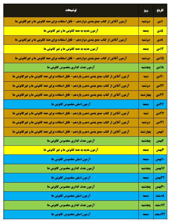 از روز دوشنبه 1 دی ماه سه آزمون جمع بندی از کتاب جمع بندی دوازدهم خواهید داشت . کتاب جمع بندی دوازدهم شامل چهار آزمون است که سه آزمون آن مربوط به نیم سال اول و یک آزمون مربوط به نیمی از نیم سال دوم است این آزمون چهارم در اسفند ماه برگزار خواهد شد . سه آزمون اول را از روز دوشنبه 1 دی هر هفته در روزهای دوشنبه برگزار خواهید کرد . برای جمع بندی پایه 6 آزمون در کتاب جمع بندی پایه داریم که از روز 20دی ماه طی دو هفته و هر هفته 3 آزمون برگزار خواهید کرد .