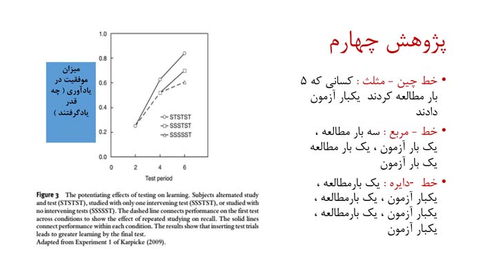 اتفاق چهارم هم در هنگام آزمون دادن رخ می دهد . این اتفاق چهارم اتفاقی عجیب و برخلاف انتظار است . اتفاق چهارم این است : در همان زمان که دارید امتحان می دهید و کتاب در جلوی شما نیست و فقط سوال ها را می بینید در همان زمان دارید یاد می گیرید . در زمان امتحان دادن و وقتی بازیابی می کنیم موضوعات را به روشی جدید و متفاوت یادمی گیریم.