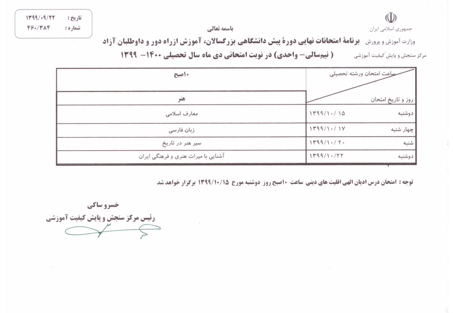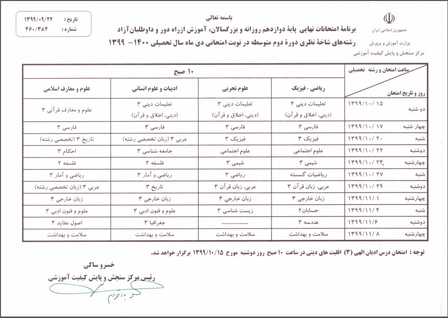 در راستای برنامهریزی، طراحی سؤالات و برگزاری امتحانات نهایی و غیر نهایی در سال 99 و بر اساس مجوز مرکز مدیریت بیماری واگیردار در دوران شیوع بیماری کرونا، از سوی مرکز سنجش و پایش کیفیت آموزشی برنامه امتحانات نهایی پایه دوازدهم روزانه و بزرگسالان، آموزش از راه دور و داوطلبان آزاد رشتههای شاخه نظری دوره دوم متوسطه ابلاغ شد.