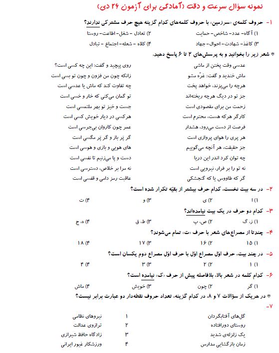 در ادامه برای شما 20 سوال سرعت و دقت برای آمادگی آزمون 26 دی آورده شده است. این سوالات را پاسخ دهید و سپس پاسخ خود را با فایل پی دی اف که بعد از سوالات برای شما قرار داده شده است مقایسه کنید.