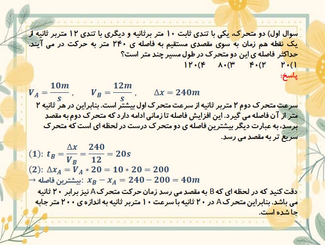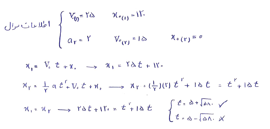 کامنت کاربر: دوچرخه سواری با سرعت ثابت 25 متر بر ثانیع در حرکت است . دوچرخه سوار دیگری با سرعت 15 متربر ثانیع ب دنبال آن در حرکت است . زمانی ک فاصله آن دو 120 متر است دومی حرکتش را با شتاب 2 متر بر مجذور ثانیه تند میکند . این دو بعد از چه مدتی به هم میرسند ؟ _تاریخ ثبت:13990906 (ثبت شده در صفحه ی مقطع دوازدهم تجربی)