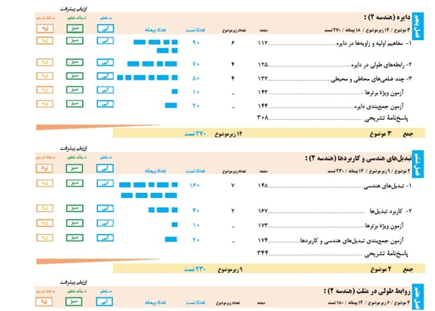 فهرست کتاب مشاوره ای و شامل اطلاعات مفیدی است. بدین معنی که دانش آموز می تواند ارزیابی پیشرفت خود را جلوی هر زیر موضوع علامت بزند. در ضمن دانش آموزان می توانند از روی تعداد سوال هر زیر موضوع به اهمیت آن زیر موضوع پی ببرند.