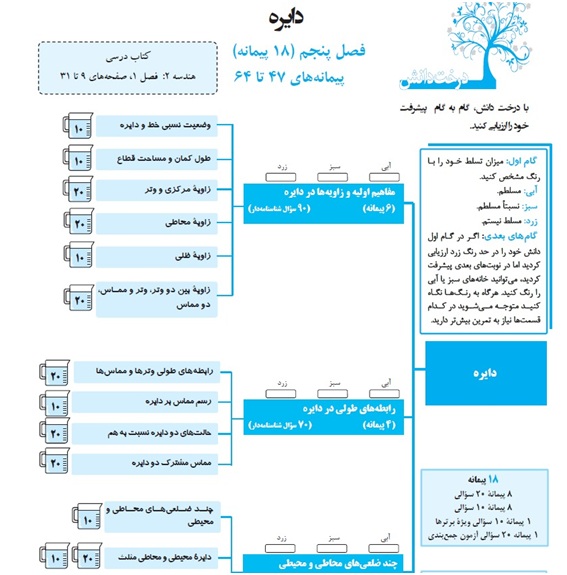 درخت دانش در واقع راهنمایی طبقه بندی هر فصل کتاب است. زیر موضوعات به نحوی است که تناظر یک به یک با زیر موضوعات کتاب درسی دارد. این موضوع باعث نظم ذهنی دانش آموز و ارتباط موثر کتاب آبی با کتاب درسی خواهد شد. دانش اموز هنگام مطالعه کتاب درسی دقیقا می تواند به همان زیر موضوع در کتاب آبی مراجعه کرده و تست های مربوط به آن را حل کند.