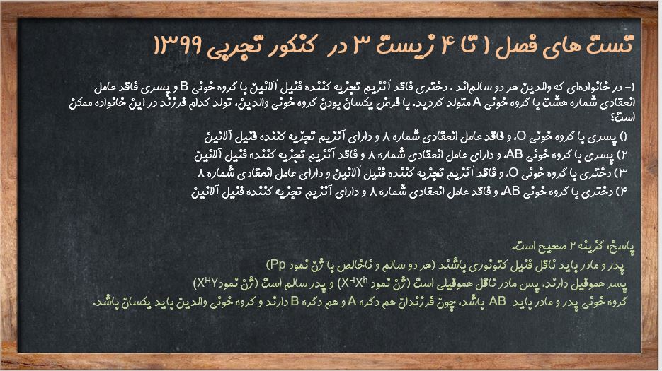 کامنت کاربر: اگر در نتیجه ازدواج زنی با گروه خونی بی با مردی واجد گروه خونی نامشخص، فرزندی متولد شود که در سطح گویچههای قرمز خود فقط کربوهیدرات آ را داشته باشد، انگاه کدام گزینه در مورد اعضای این خانواده صحیح بیان شده؟ (من فقط اینو مشکل داشتم): تولد فرزندی فاقد توانایی تولید کربوهیدراتهای گروه خونی اصلی در این خانواده ممکن است؛درسته یا غلطه؟ - تاریخ ثبت: 13990929دوازدهم تجربی - ثبت شده در صفحه مقطع: دوازدهم تجربی