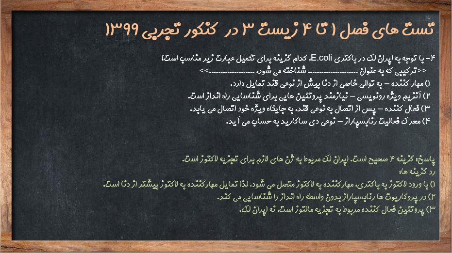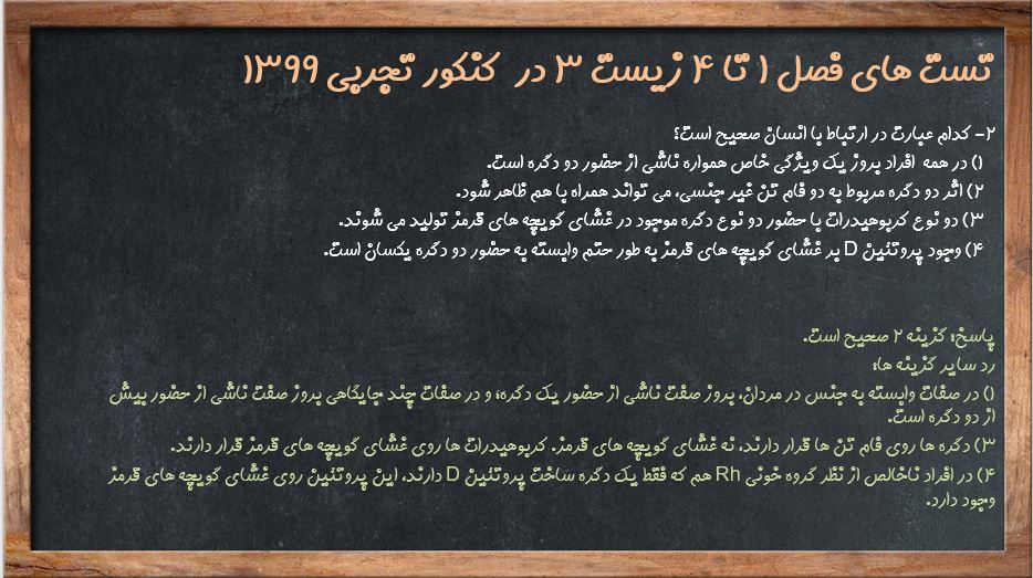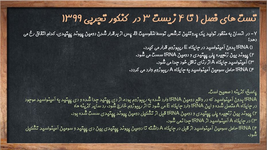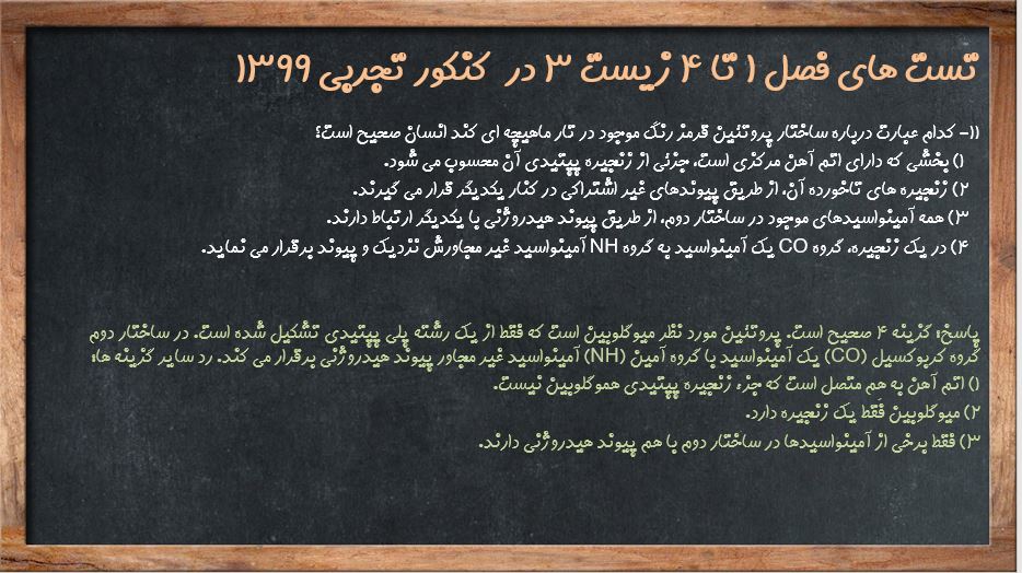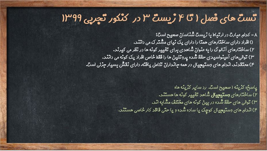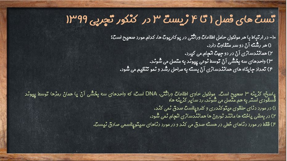 در ادامه تست های این 4 فصل در کنکور تجربی 1399 نظام جدید آمده. بهتر است سعی کنید خودتان به تست ها پاسخ دهید و سپس پاسخ و استدلال خود را با پاسخ تشریحی مقایسه کنید و در صورت لزوم حتما به کتاب درسی رجوع کنید. اگر سوال یا اشکالی در مورد تست ها یا به طور کلی مطالب زیست3 نیم سال اول داشتید، در قسمت نظرات بپرسید.