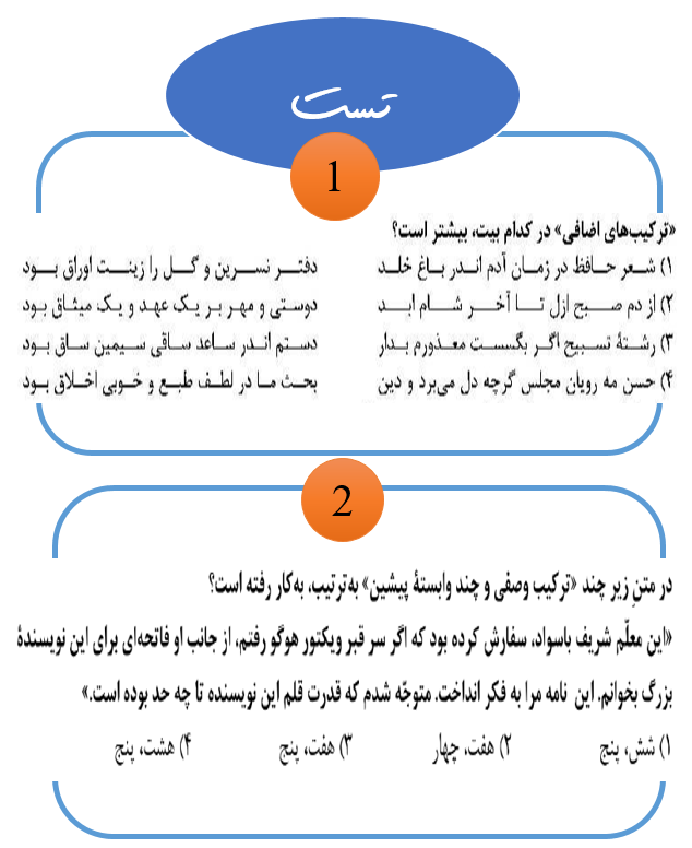 نگاهی مختصر بر ترکیب وصفی و اضافی داشتیم و اکنون زمان این است که مطالب گفته شده را با چند تست تثبیت کنیم: