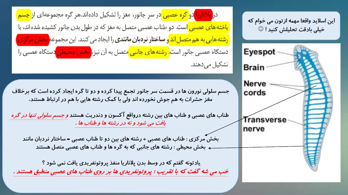 پاسخ کامنت(آی نور جباری، تجربی نظام جدید - گنبد) : سلام، طناب عصبی پلاناریا جسم یاخته ای نداره - تاریخ ثبت :13990923(از صفحه ی دوازدهم تجربی)
