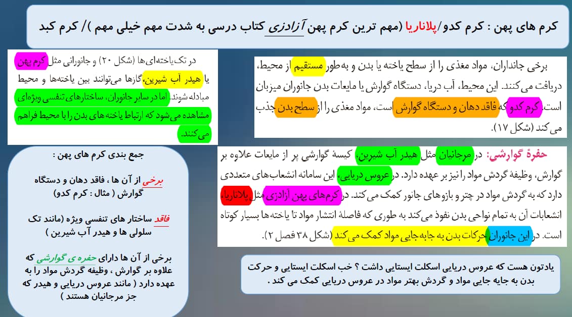 این قسمت از جمع بندی جانوری : کرم های پهن / کرم های حلقوی / کرم های پهن بررسی شده اند .