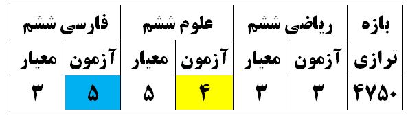 مطابق جدول بالا آزمون امروز در بازه ترازی 4750 در درس های علوم و فارسی به ترتیب یک واحد دشوارتر و دو واحد ساده تر از معیار بوده است.در درس ریاضی هم منطبق با معیار بوده است.