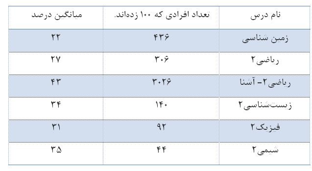 با توجه به جدول فوق، آسانترین درس، ریاضی آشنا است. بالاترین افرادی هم که درسی را صد زده اند، درس ریاضی و زمین شناسی است. نکته قابل توجه در جدول فوق، میانگین درصد و تعداد افرادی بالایی است که در درس زمین شناسی صد زدهاند.