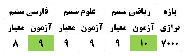 مطابق جدول بالا سطح دشواری آزمون امروز برای بازه ی ترازی 7000 در درس علوم منطبق با معیار و در درس های ریاضی و فارسی یک واحد ساده تر از معیار بوده است.