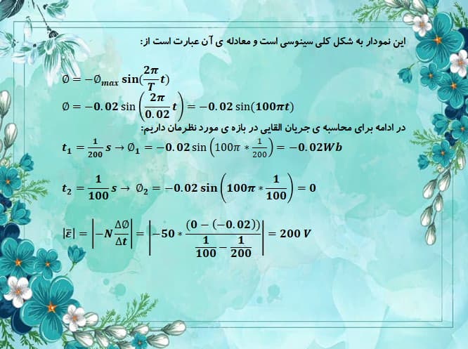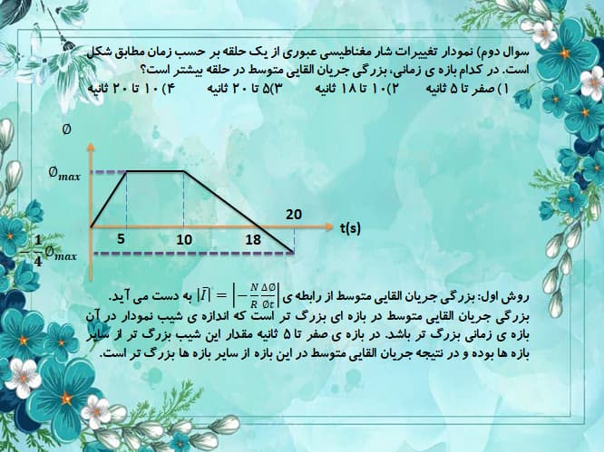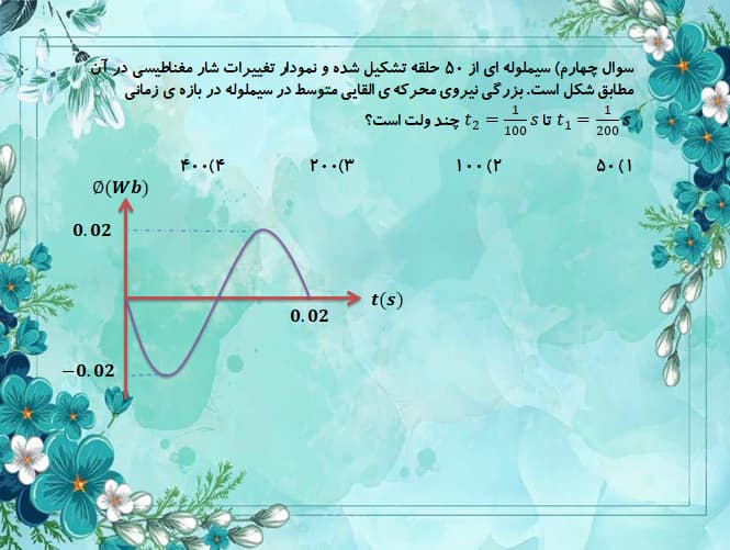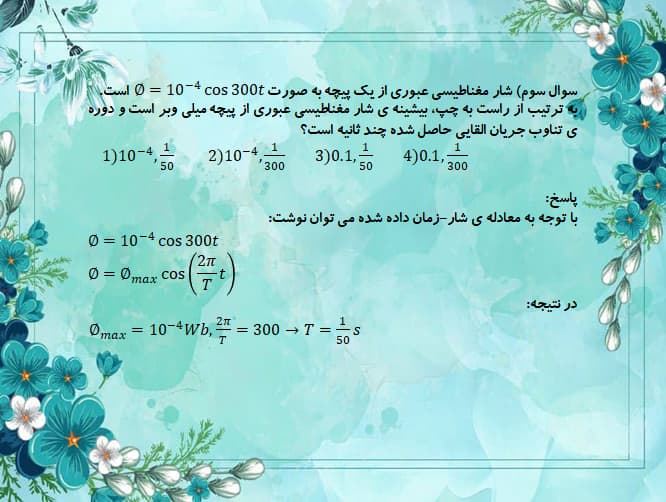 کامنت کاربر: پیچه ای به مقاومت 2 اهم از 50 حلقه هر یک به مساحت 100 سانتی متر مربع تشکیل شده است . سطح این قاب عمود بر خطوط میدان مغناطیسی یکنواختی به شدت 1 گاوس قرار دارد . اگر قاب را به اندازه 180 درجه بچرخانیم تا دوباره عمود بر خطوط میدان شود ، بار الکتریکی متوسط عبوری از یک مقطع از پیچه چند میکروکولن است ؟ ( سوالم اینه که چرا اینجا وقتی خود صورت سوال میگه سطح قاب دوباره عمود بر خطوط میدان شده ، ولی در پاسخنامه (دلتا تتا رو 180 ) در نظر گرفته ؟ من فکر میکردم بار الکتریکی عبوری صفر باشه.... ) _تاریخ ثبت:13990511 (ثبت شده در صفحه ی مقطع دوازدهم ریاضی)