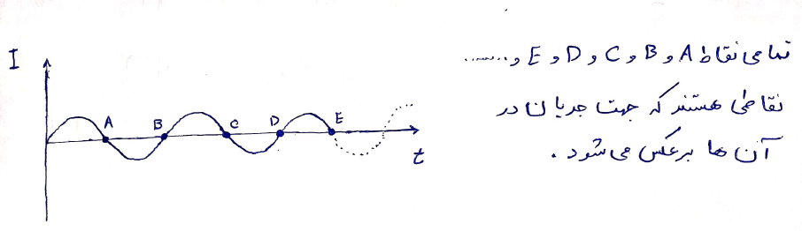 پاسخ کامنت آرمین کاملی - ساری: سلام.در زمان هایی که نمودار با محور ایکسها برخورد میکنه جهت جریان عوض میشه،یعنی تی ،دو تی،سه تی و ... ی مثال میزنم :از صفر تا تی دوم جریان زیاد میشه و از تی دوم تا تی جریان کم میشه تا در تی به صفر برسه اما جهتش همونه و تغییر نمیکنه وقتی از تی میگذره دوباره شروع به افزایش میکنه ولی جهتش عوض میشه و همینطور سینوسی این تکرار میشه. _تاریخ ثبت:13990426 (ثبت شده در صفحه ی دوازدهم تجربی)