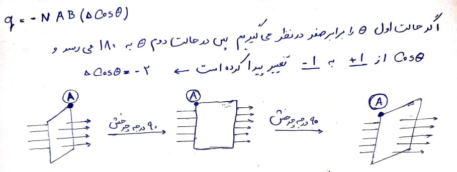 پاسخ کامنت آرش فتانی فرشباف، ریاضى نظام جدید - تبریز - میانگین تراز 7133: ما گفتیم نیروی محرکه در سه حالت القا میشه یا میدان تغییر کنه یا مساحت مقطع یا کسینوس زاویه بین نیم خط عمود و میدان وقتی که 180 درجه دوران پیدا میکنه زاویه بین نیم خط عمود و میدان از صفر به 180 درجه میرسه که کسینوسش از 1 به منفی 1 میرسه(در حالت اول بردار عمود بر سطح و میدان هم جهت هستند ولی در حالت دوم هم راستا ولی در خلاف جهت هم هستند)(چون مشخص نشده فکر کنم میتونیم بگیم که در حالت اول زاویه بینشون 180 بود و در حالت دوم صفر درجه ولی تاثیری در جواب آخر نداره) _تاریخ ثبت: 13990511 (ثبت شده در صفحه ی مقطع دوازدهم)