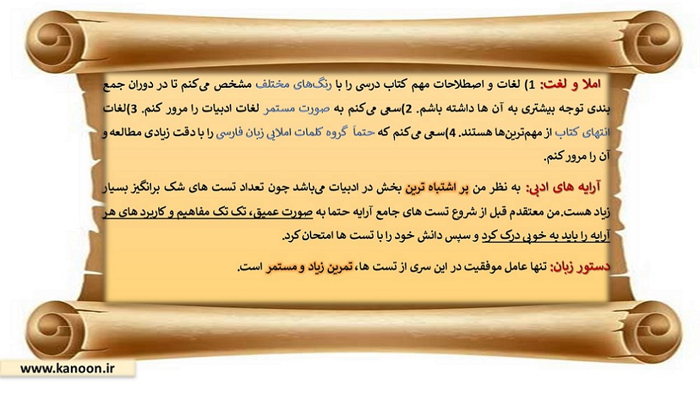 در این مطلب دو نفر از دانش آموزان برتر امسال، روش مطالعه خود (کلکسیون روش مطالعه) را در درس ادبیات با شما به اشتراک گذاشته اند.