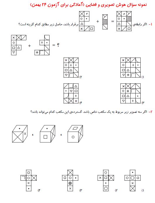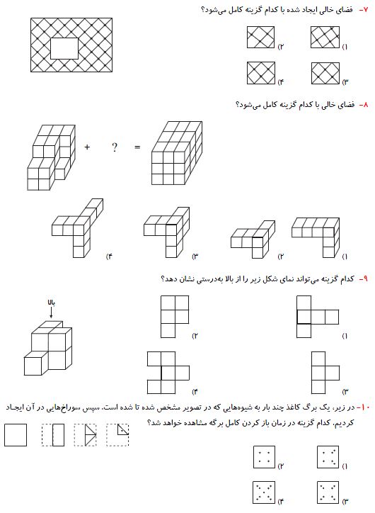 در ادامه برای شما 10 سوال هوش تصویری و فضایی برای آمادگی آزمون 24 بهمن آورده شده است. این سوالات را پاسخ دهید و سپس پاسخ خود را با فایل پی دی اف که بعد از سوالات برای شما قرار داده شده است مقایسه کنید.