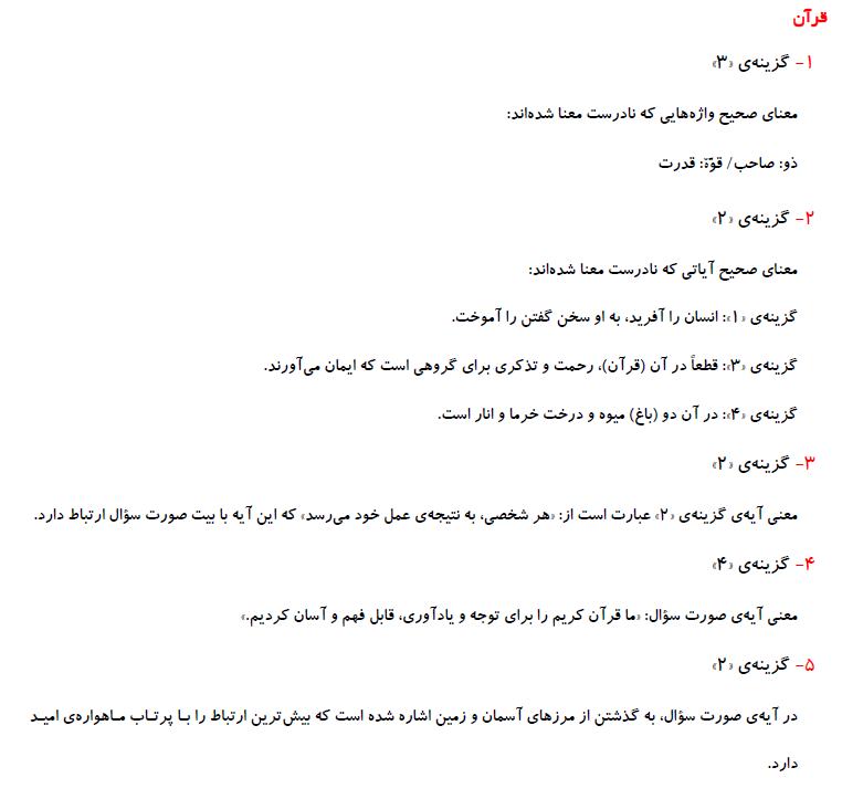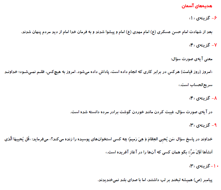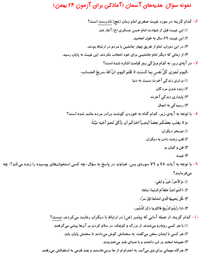 ششمی های عزیز سلام5 سوال قرآن و 5 سوال هدیه های آسمان ویژه ی آمادگی برای آزمون 24 بهمن به همراه پاسخ تشریحی در ادامه آورده شده است. موفق باشید.فرزانه خاکپاش - گروه تولید آزمون