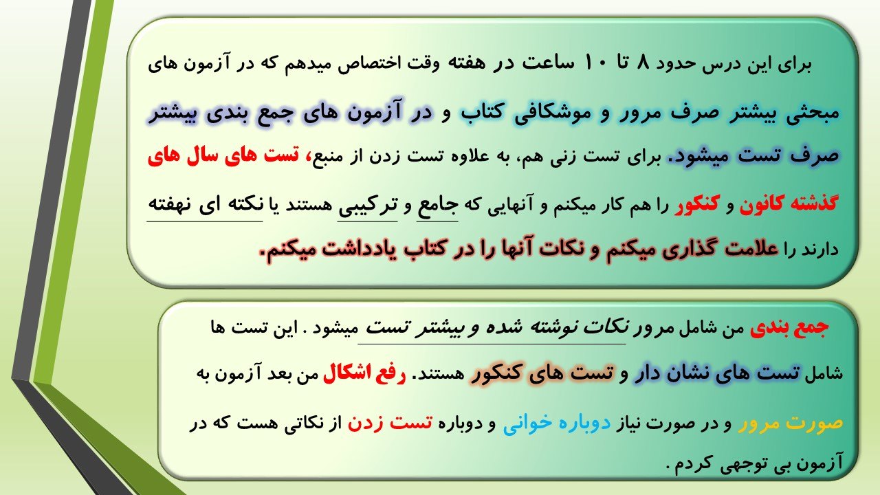 در این مطلب دو نفر از دانش آموزان برتر امسال، روش مطالعه خود (کلکسیون روش مطالعه) را در درس دینی با شما به اشتراک گذاشته اند.