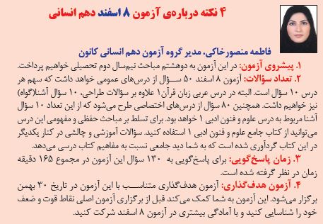 نکاتی در مورد آزمون 8 اسفند دهم انسانی