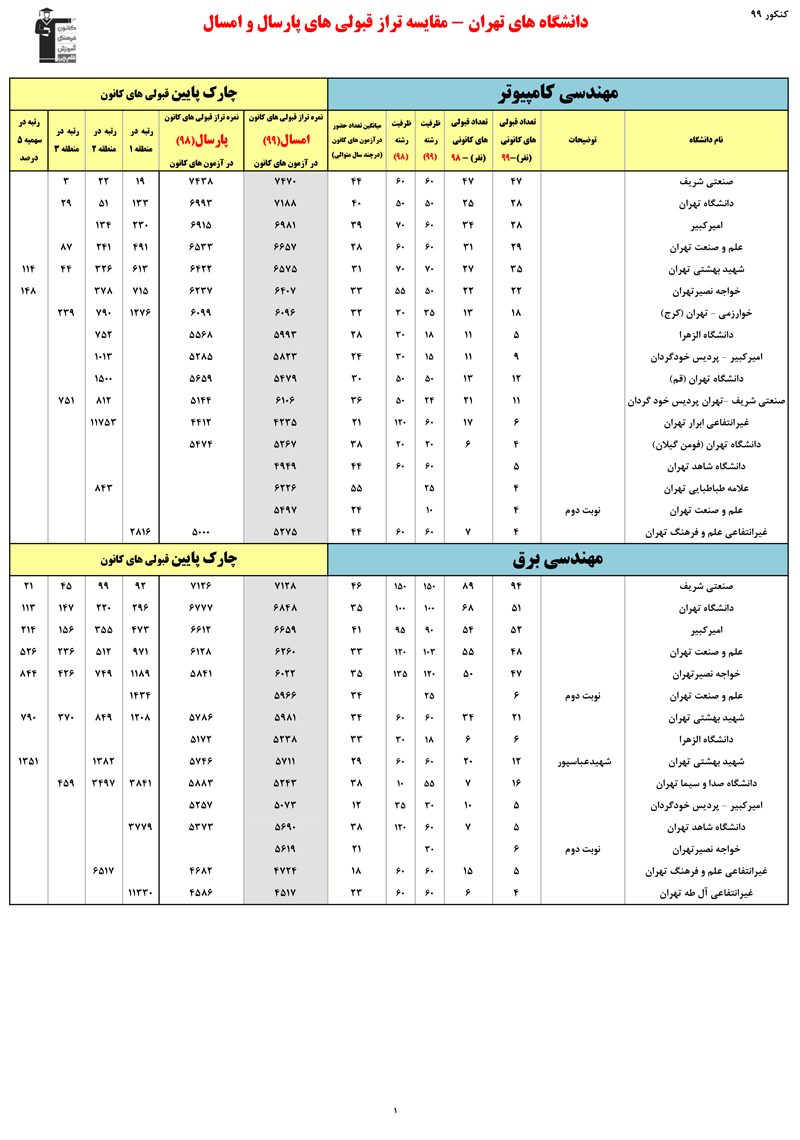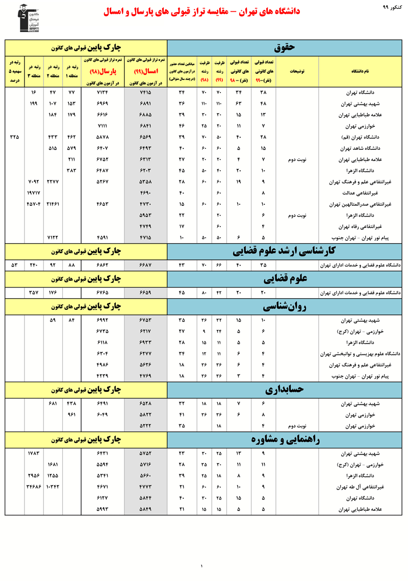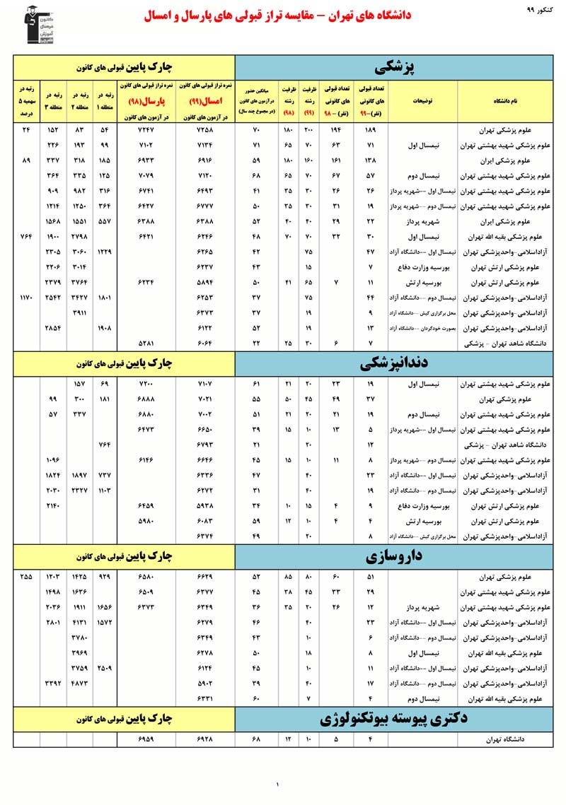 در جدول های زیر شما می توانید نمره ی تراز کانونی ها در دانشگاه های تهران در سال 98 (قبل از کرونا) و سال 99 ( بعد از کرونا) با هم مقایسه کنید .