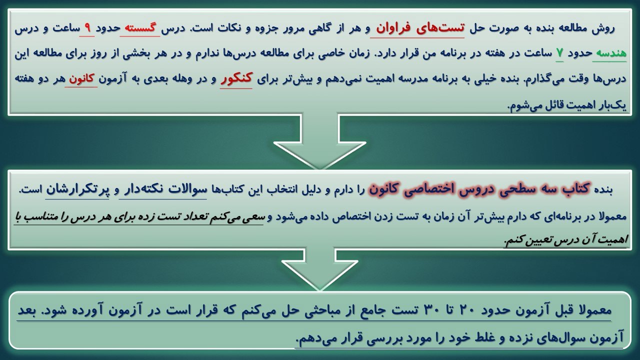 محمد جواد مهماندوست با میانگین تراز 7000 و میانگین درصد 82 در درس ریاضیات گسسته از مشهد؛ روش مطالعه خود را ( کلکسیون روش مطالعه ) در این درس با شما به اشتراک گذاشته است.