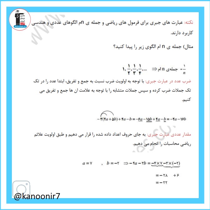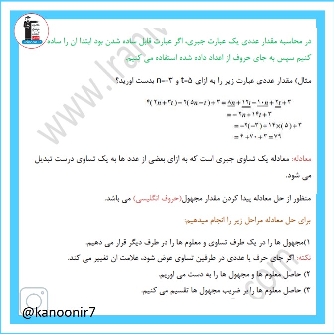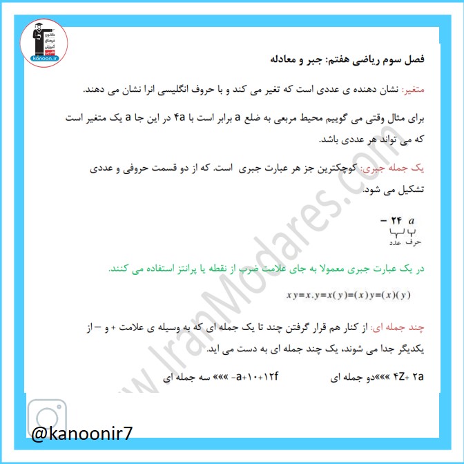 نکات کلیدی ریاضی هفتم - درسنامه کامل- مبحثی - مرور ریاضی هفتم در نوروز- پیش خوانی ریاضی - خلاصه ریاضی -مبحث جبر و معادله