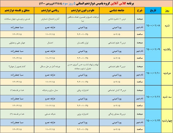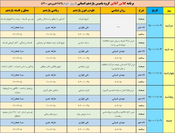 پنج روز سوم: مرور دروس نیم سال اول دوازدهم مطابق با آزمون ۲۰ فروردین کانون از ۸ فروردین تا ۱۲ فروردین