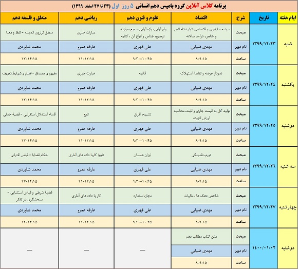 پنج روز اول: مرور دروس دهم مطابق آزمون 7 فروردین کانون از ۲۳ اسفند تا ۲۷ اسفند