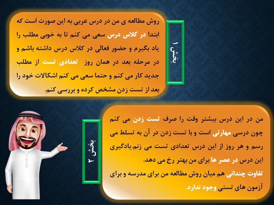 شما عربی را چگونه مطالعه می کنید؟! آیا در مطالعه این درس روش خاصی دارید ؟! در قسمت کامنت ها یادداشت کنید.