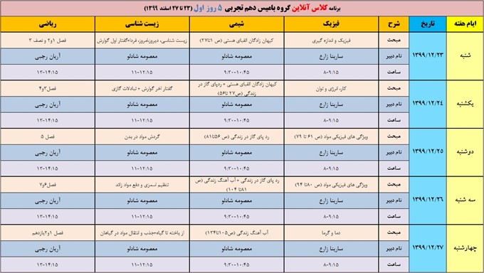 پنج روز اول: مرور دروس دهم مطابق آزمون 7 فروردین کانون از ۲۳ اسفند تا ۲۷ اسفند