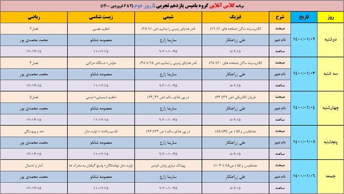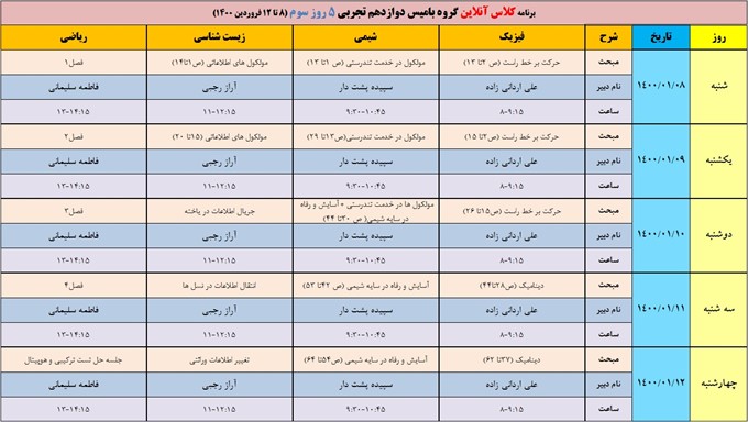 پنج روز سوم: مرور دروس نیم سال اول دوازدهم مطابق با آزمون ۲۰ فروردین کانون از ۸ فروردین تا ۱۲ فروردین