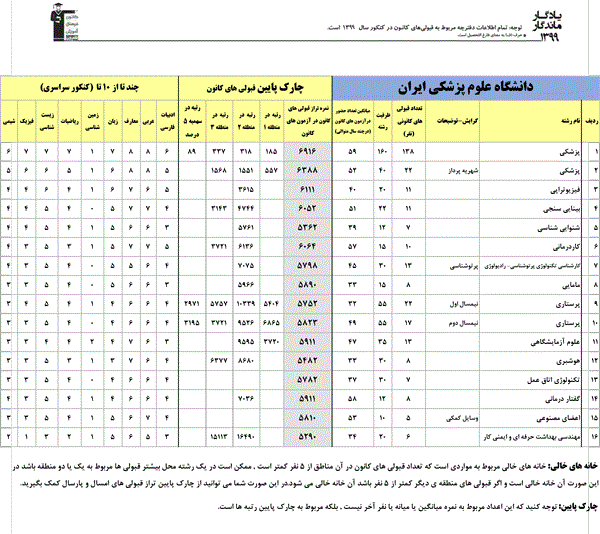 یادگار ماندگار : قبولی های کانونی دانشگاه علوم پزشکی ایران در همه رشته ها در سال 99 را در ادامه مشاهده کنید.فایل با کیفیت قبولی های سال 99 را در قسمت فایل های ضمیمه دانلود کنید.