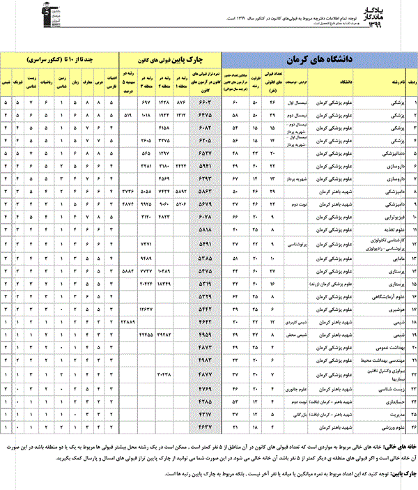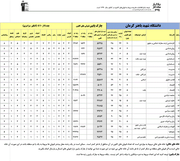 یادگار ماندگار : قبولی های کانونی دانشگاه شهید باهنر کرمان و دانشگاه علوم پزشکی کرمان در همه رشته ها در سال 99 را در ادامه مشاهده کنید.فایل با کیفیت قبولی های سال 99 را در قسمت فایل های ضمیمه دانلود کنید.
