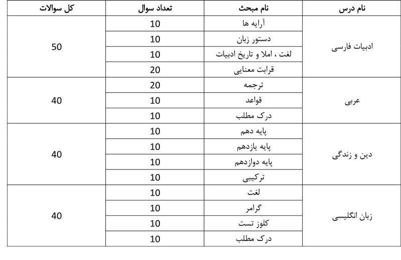 این آزمون شامل 170 سوال خواهد بودکه به صورت مبحثی برگزار می شود.