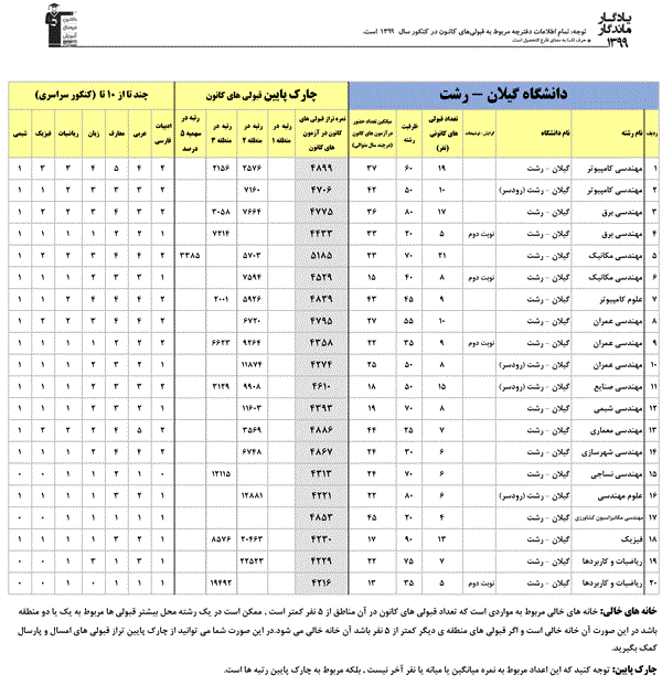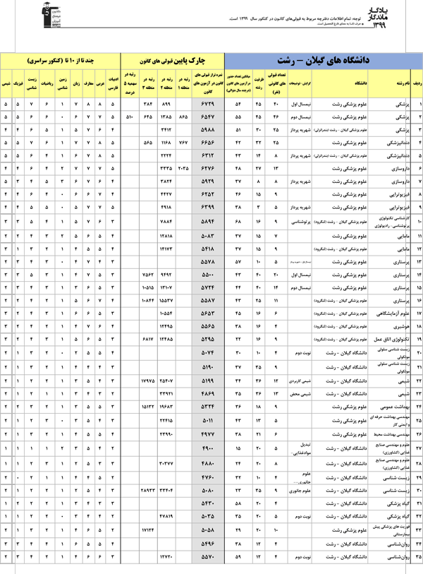 یادگار ماندگار : قبولی های کانونی دانشگاه گيلان - رشت و دانشگاه علوم پزشکي رشت در همه رشته ها در سال 99 را در ادامه مشاهده کنید.فایل با کیفیت قبولی های سال 99 را در قسمت فایل های ضمیمه دانلود کنید.