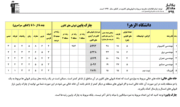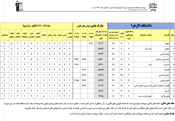 یادگار ماندگار : قبولی های کانونی دانشگاه الزهرا در همه رشته ها در سال 99 را در ادامه مشاهده کنید.فایل با کیفیت قبولی های سال 99 را در قسمت فایل های ضمیمه دانلود کنید.