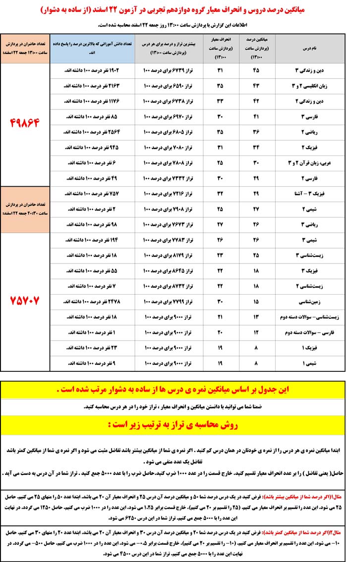 ضمنا شما می توانید با دانستن میانگین و انحراف معیار ، تراز خود را در هر درس محاسبه کنید. روش محاسبه ی تراز به ترتیب زیر است :