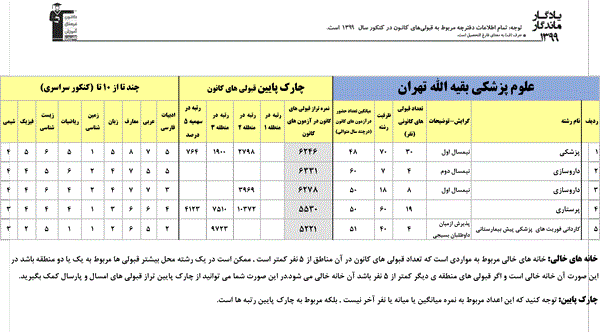 یادگار ماندگار : قبولی های کانونی دانشگاه علوم پزشکي بقيه الله تهران در همه رشته ها در سال 99 را در ادامه مشاهده کنید.فایل با کیفیت قبولی های سال 99 را در قسمت فایل های ضمیمه دانلود کنید.