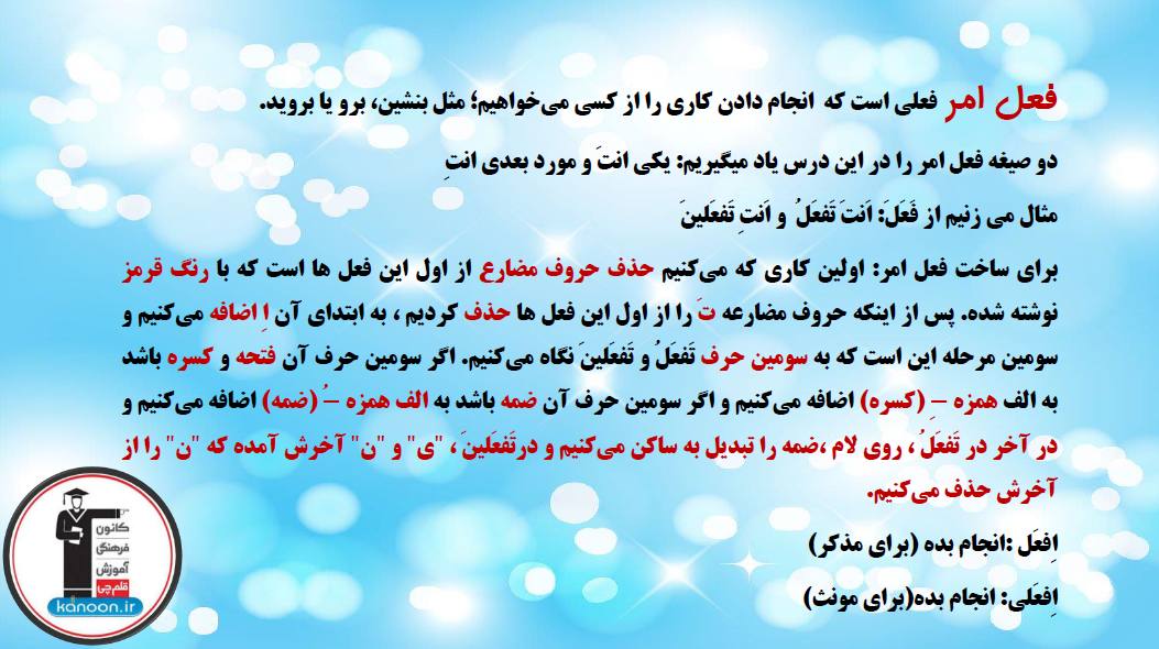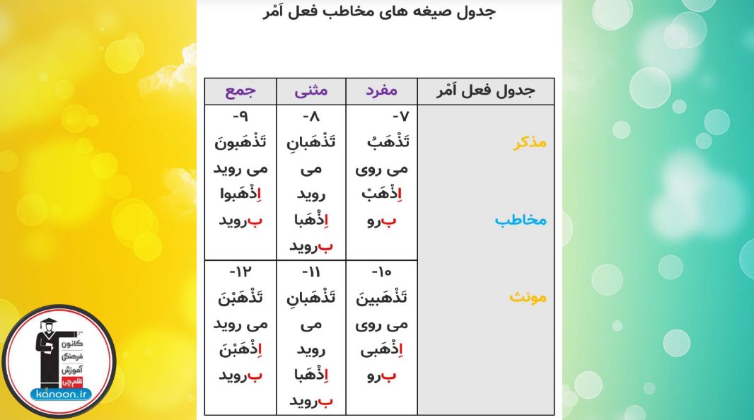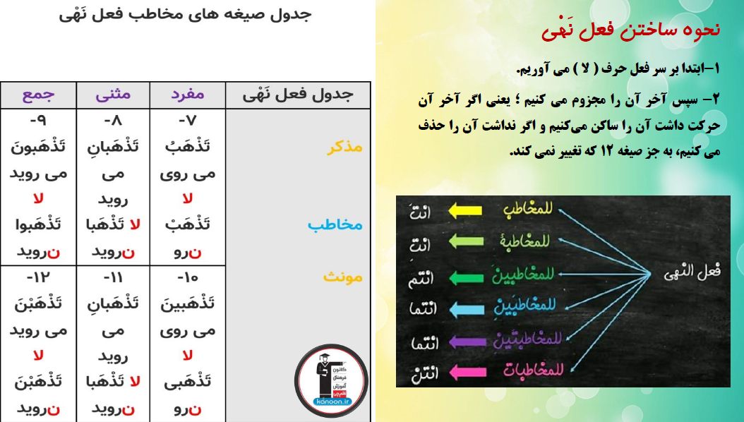 همان طور که می دانید، آزمون جمع بندی 7 فروردین شامل دروس یک تا پنج عربی نهم است. در این مطلب قواعد مهم و نکات دستوری فعل نهی و امر را برای شما عزیزان بازگو کردیم. هم چنین وزن کلمات واسامی حیوانات را به همراه تصاویر مرور کردیم.