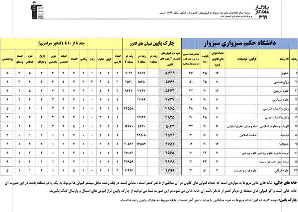 یادگار ماندگار : قبولی های کانونی دانشگاه حكيم سبزواري سبزوار و دانشگاه علوم پزشکي سبزوار در همه رشته ها در سال 99 را در ادامه مشاهده کنید.فایل با کیفیت قبولی های سال 99 را در قسمت فایل های ضمیمه دانلود کنید.