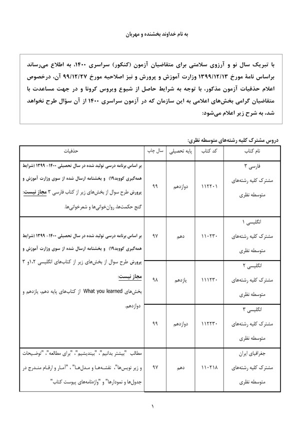 حذفیات آزمون سراسری سال 1400 توسط سازمان سنجش اعلام شد.اعمال حذفیات کنکور 1400 در آزمونهای بعد از عید کانونفایل با کیفیت را در قسمت فایل های ضمیمه پایین مطلب دانلود کنید.