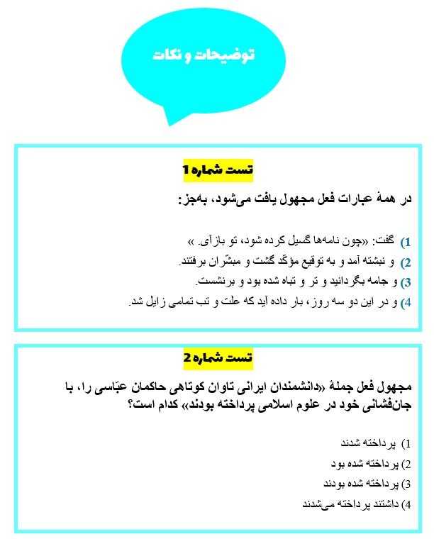 مروری مختصر بر فعل معلوم و مجهول داشتیم و اکنون زمان این است که مطالب گفته شده را با چند تست تثبیت کنیم:
